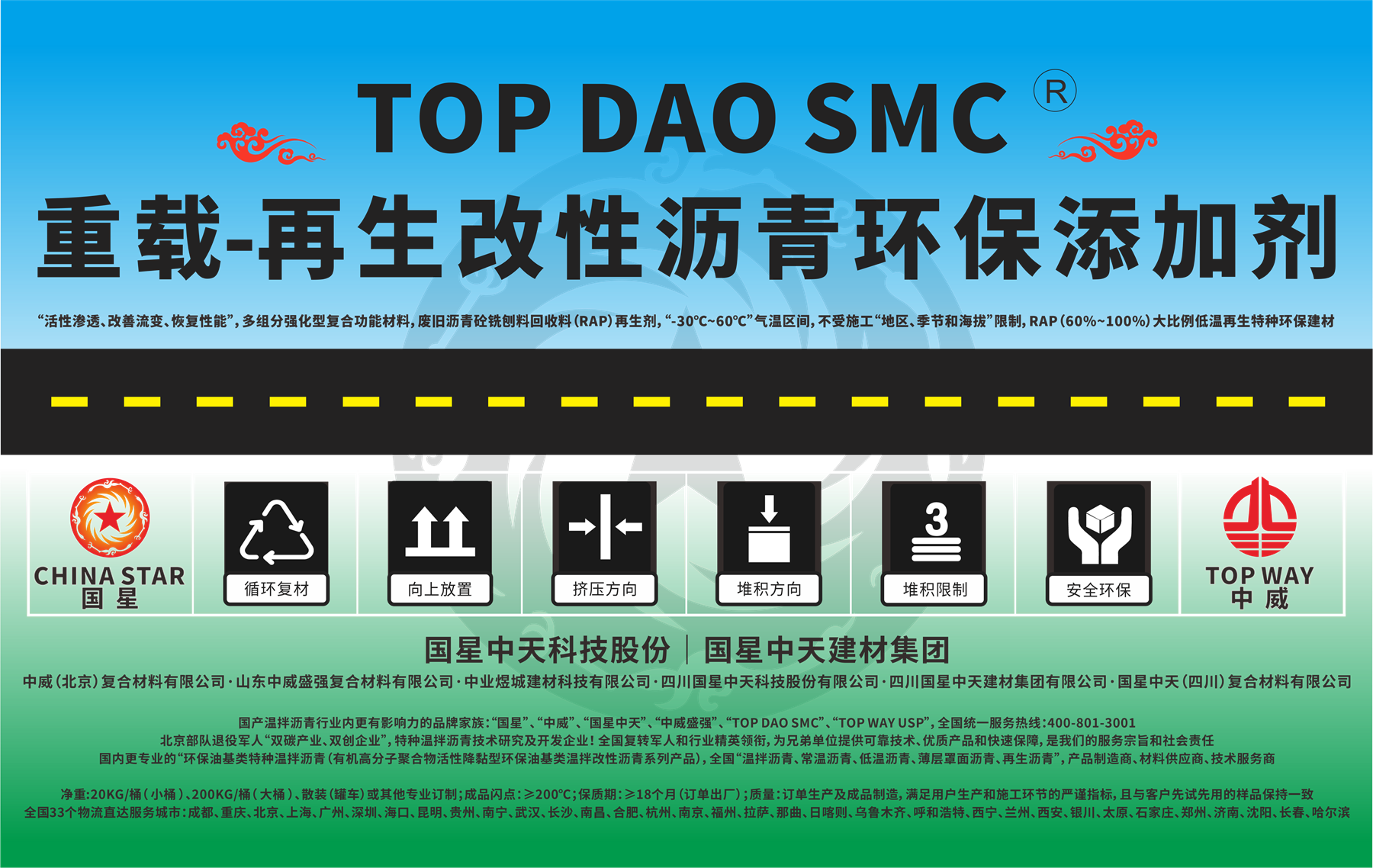 国星中天集团注册商标:“TOP DAO SMC” 、“TOP WAY USP”、“国星中天”。国星中天旗下“低温改性沥青”(特种温拌改性沥青)系列产品,全球重载型道路交通专用特种绿色路面建养材料。中国低温改性沥青、有机降黏型(油基类)特种温拌沥青行业,注册商标、知名品牌,拥抱“双碳政策”!服务“低碳交通”!打造中国“常温沥青、低温沥青、温拌沥青、超薄沥青、再生沥青”等“绿色低碳沥青”的基础研究、产品开发、生产制造、物流配送和技术服务龙头企业!