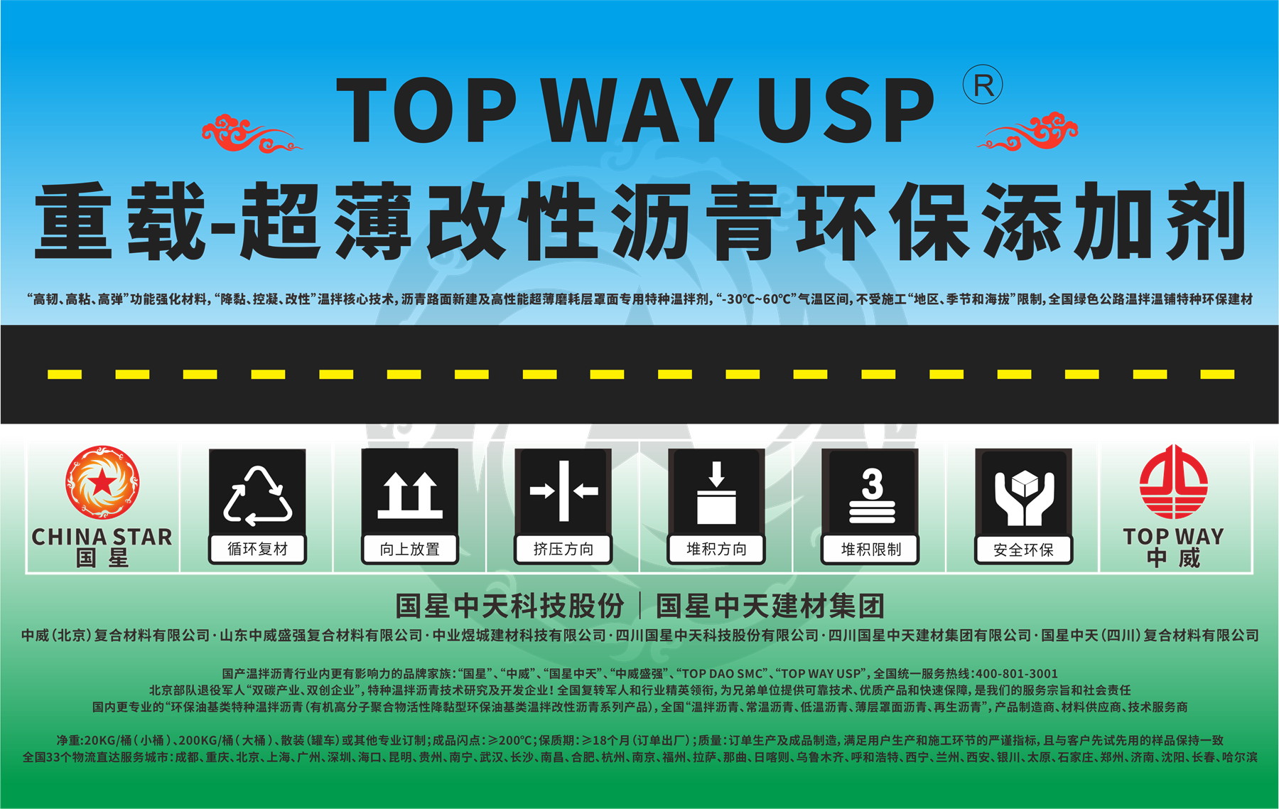 国星中天集团注册商标:“TOP DAO SMC” 、“TOP WAY USP”、“国星中天”。国星中天旗下“低温改性沥青”(特种温拌改性沥青)系列产品,全球重载型道路交通专用特种绿色路面建养材料。中国低温改性沥青、有机降黏型(油基类)特种温拌沥青行业,注册商标、知名品牌,拥抱“双碳政策”!服务“低碳交通”!打造中国“常温沥青、低温沥青、温拌沥青、超薄沥青、再生沥青”等“绿色低碳沥青”的基础研究、产品开发、生产制造、物流配送和技术服务龙头企业!