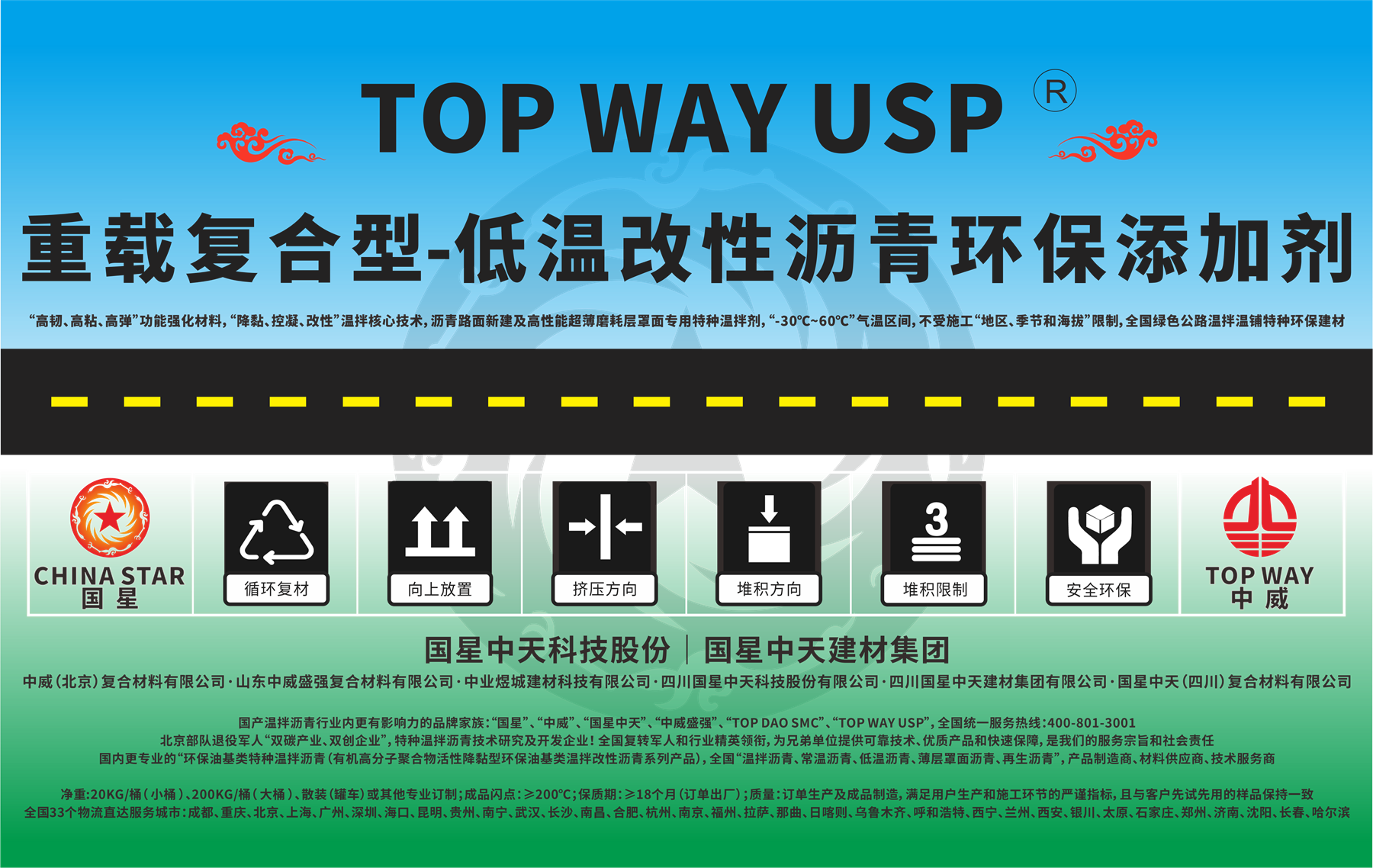 国星中天集团注册商标:“TOP DAO SMC” 、“TOP WAY USP”、“国星中天”。国星中天旗下“低温改性沥青”(特种温拌改性沥青)系列产品,全球重载型道路交通专用特种绿色路面建养材料。中国低温改性沥青、有机降黏型(油基类)特种温拌沥青行业,注册商标、知名品牌,拥抱“双碳政策”!服务“低碳交通”!打造中国“常温沥青、低温沥青、温拌沥青、超薄沥青、再生沥青”等“绿色低碳沥青”的基础研究、产品开发、生产制造、物流配送和技术服务龙头企业!